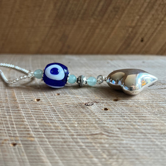 SariBlue® Aqua Quartzite Evil Eye Silver Heart Charm Baby Belly Bell® Maternity Necklace