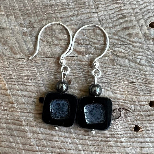 SariBlue® Black and Grey Square Czech Glass Earrings