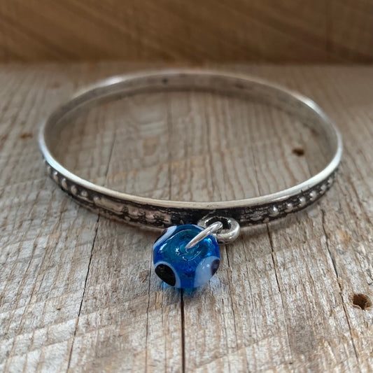 SariBlue® Boho Silver Bangle with Blue Glass Evil Eye