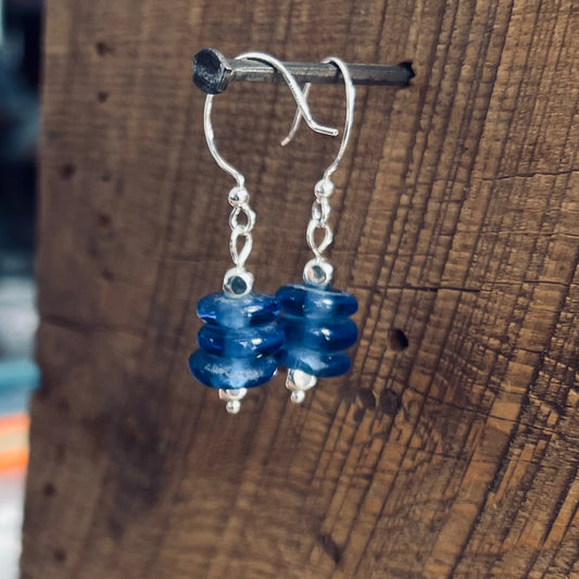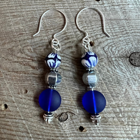 SariBlue® Boho Blue and White Ceramic Bead with a Cobalt Blue Seaglass Coin and Pewter Bead Earrings