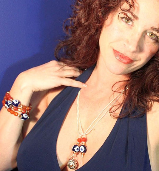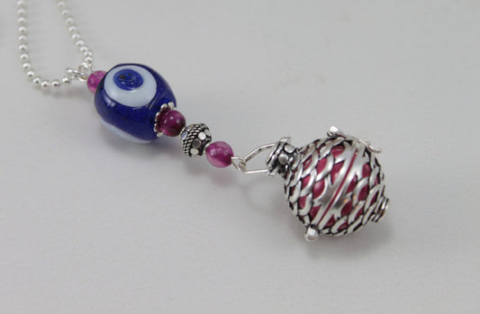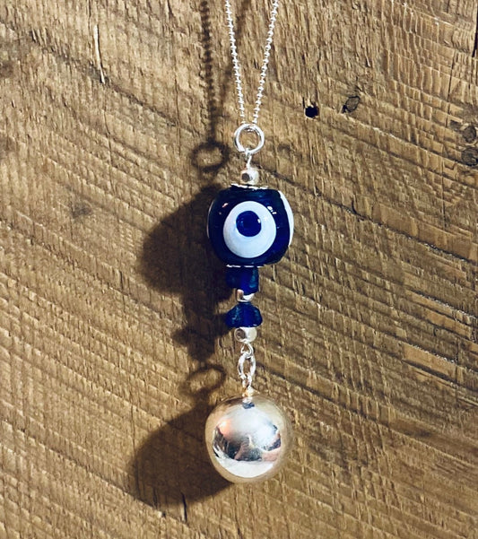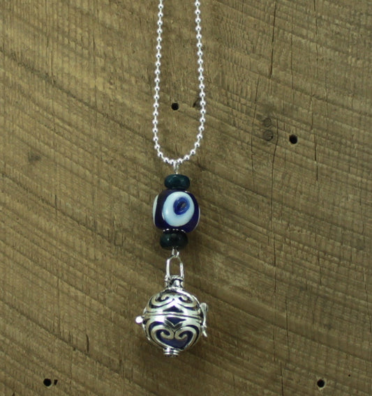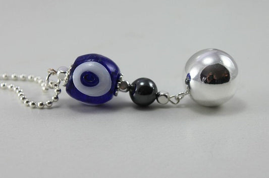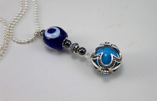 SariBlue®'s original and unique Baby Belly Bells® bring together different cultures to help soothe and protect your precious baby bump. SariBlue®has made this special piece of jewelry for you with our signature Turkish Evil Eye handmade glass beads, hand twisted sterling silver to connect a traditional Latin American Bola Chime. The Evil Eye will help to protect your soon to arrive new little person from unwanted negative energy in the universe, while the lovely sounding Bola Chime will peacefully soothe both mother and baby. The Bola Chime is used in many cultures by pregnant woman to help soothe the soon to be born baby. Once born this chime is a familiar sound for your new baby and can continue to help calm a brand new baby in their early months. The long necklace will allow the bell to fall over your beautiful baby belly and sway back and forth to chime for your baby. After the baby is born you can use the bell in the baby's room in a window or above their crib. This makes an excellent baby shower gift or congratulations gift for a close friend.