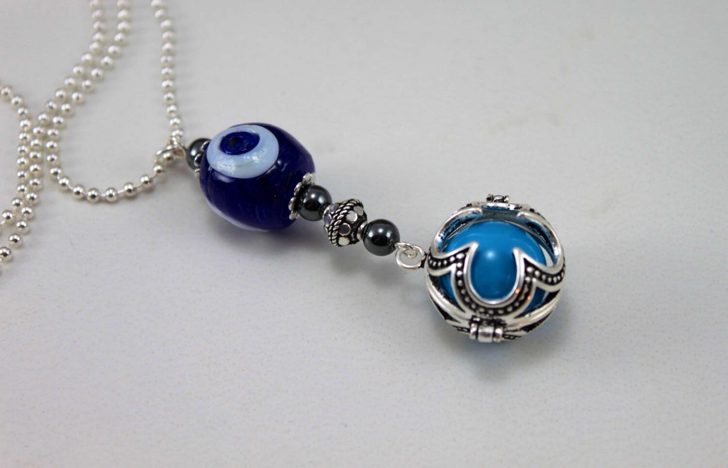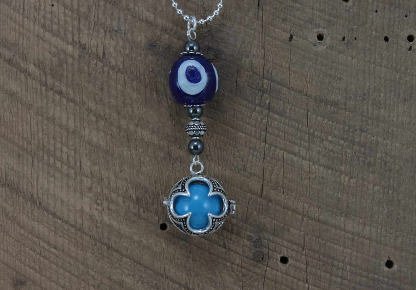 This addition to our collection uses our traditional dark blue large Evil Eye with Hematite beads to add extra grounding energy and a silver Bali bead to perfectly accent the angel caller. The chime is very open, showing the lovely blue bell held inside peacefully chiming for your true blue boy. The ensemble hangs from a 36 inch silver plate ball chain.