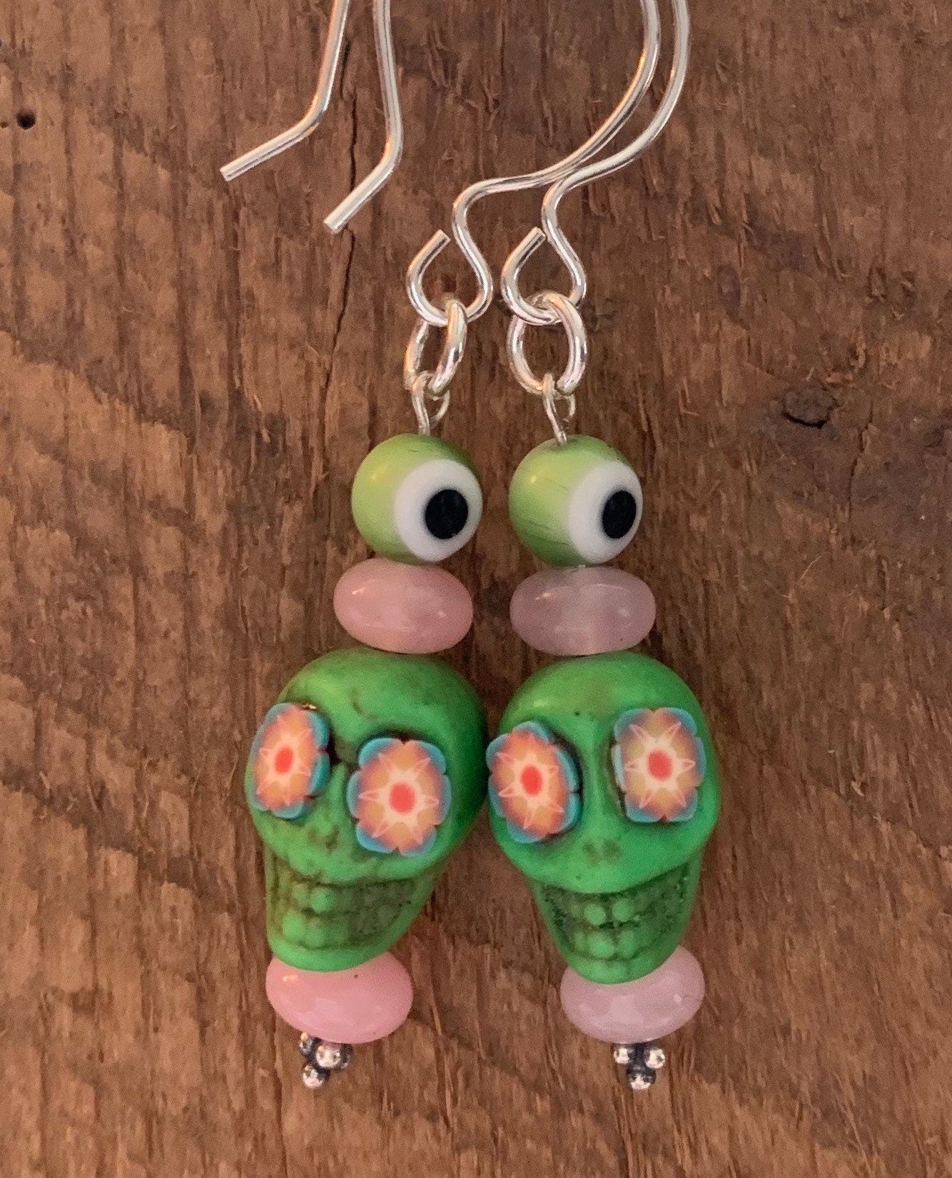 Sterling Silver Hooks with Handmade Lime Green Sugarskulls with Pink and Blue accents, Pink Accent Beads and matching Lime Green Evil Eyes. Earrings are approximately 1 inch.