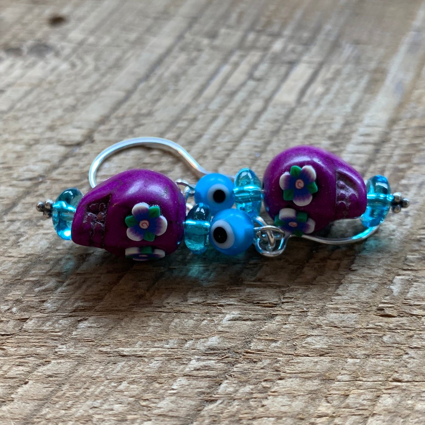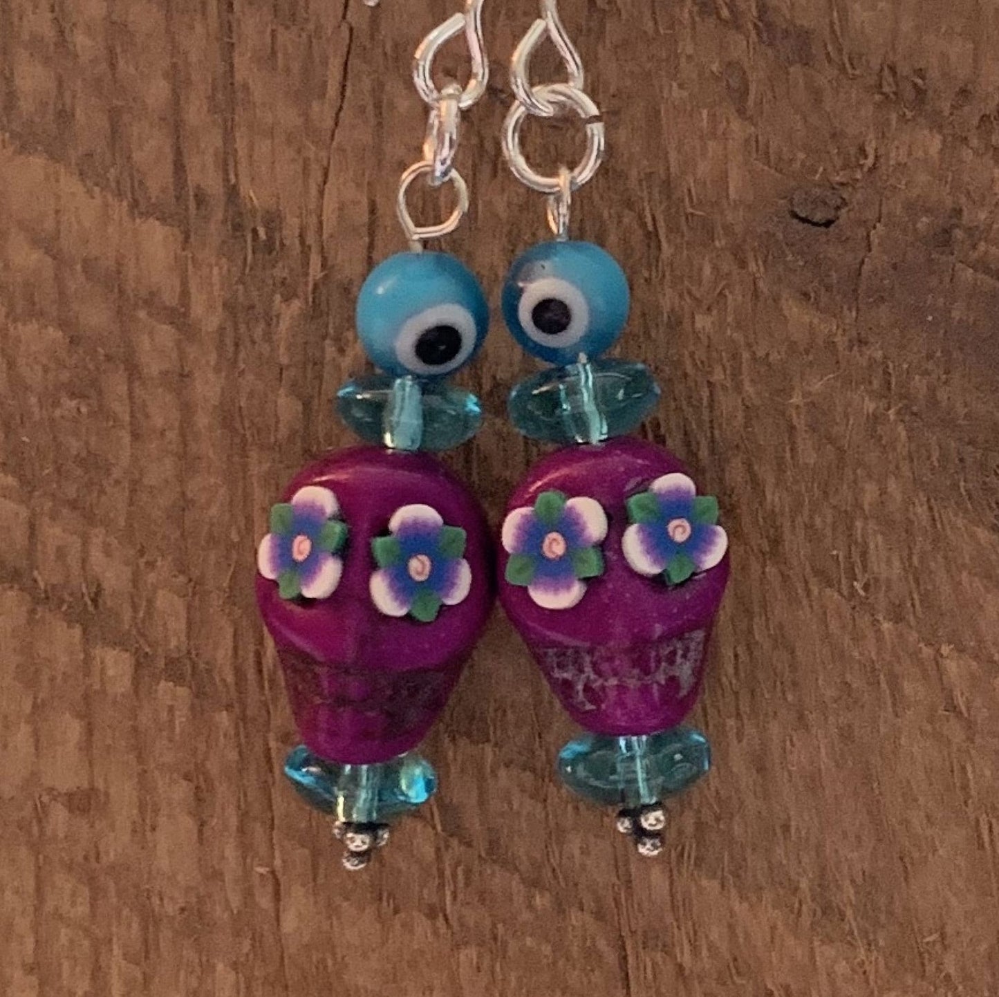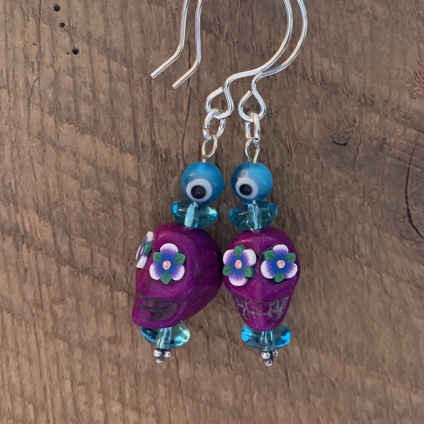 SariBlue® Purple Sugarskulls with Blue and White accents, Blue Glass Accent Beads and Blue Evil Eyes earrings on sterling silver hooks. Earrings are approximately 1 inch.