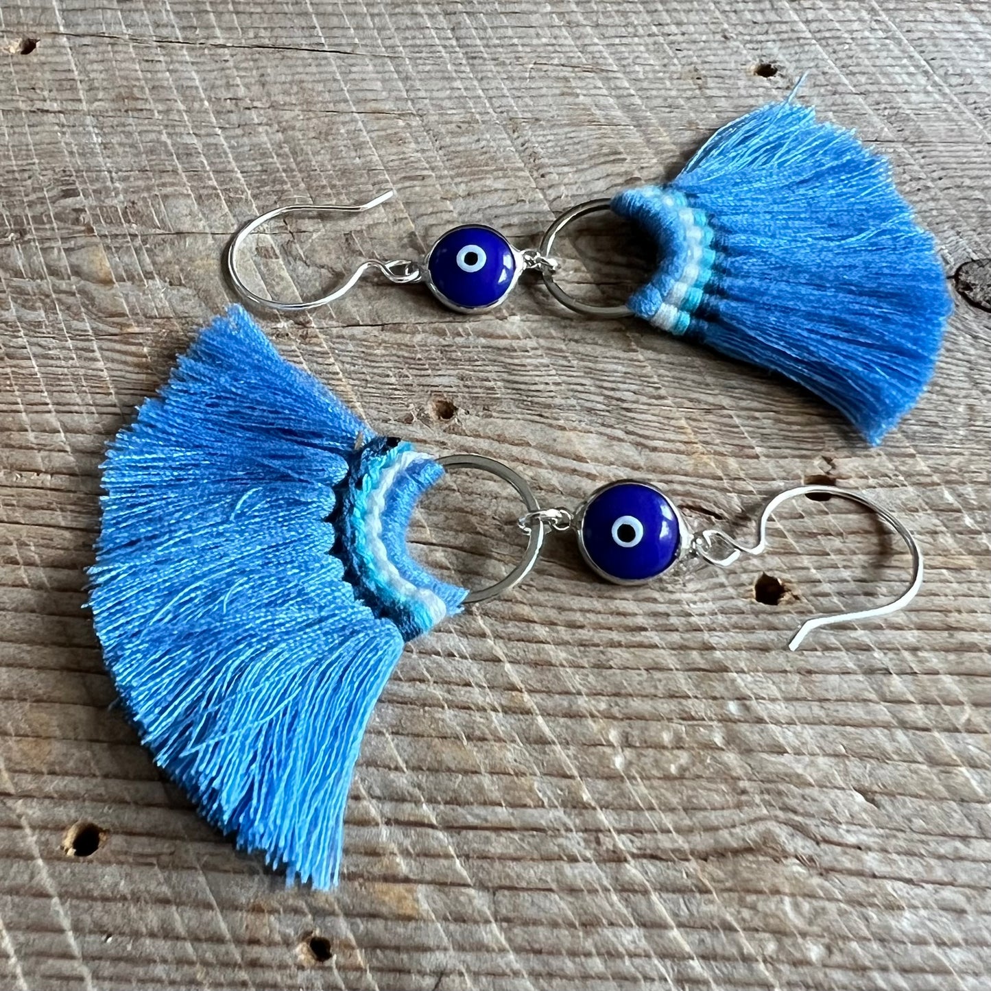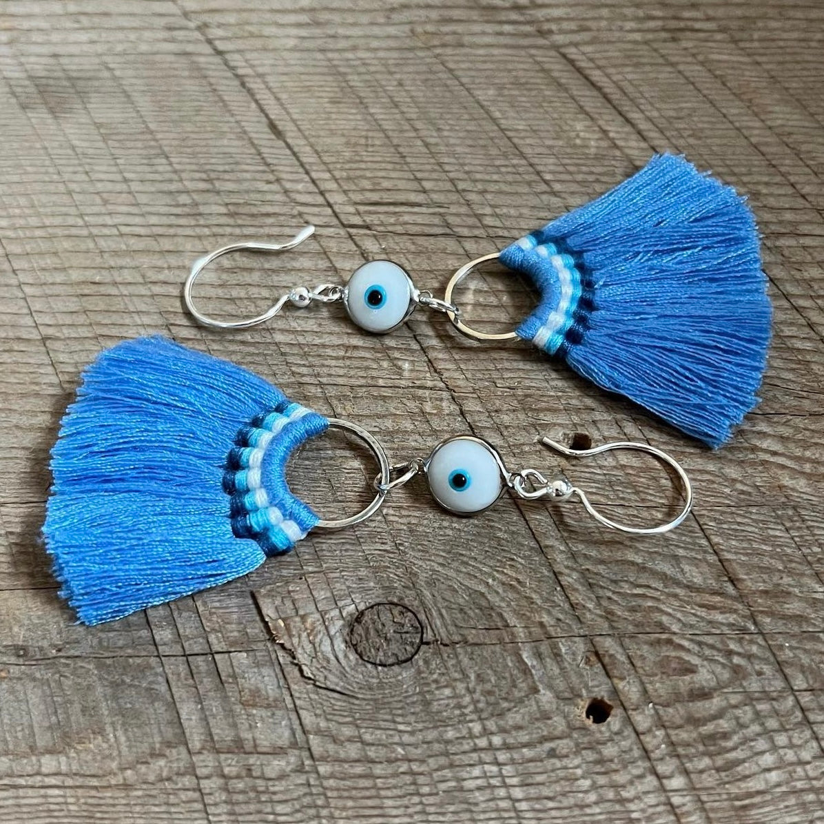 Shades of blue tassels with choice of dark blue or white evil eye crystal dangle from sterling silver hooks.