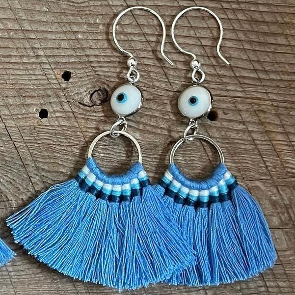 SariBlue® Shades of Mavi Tassel Earrings with Evil Eye